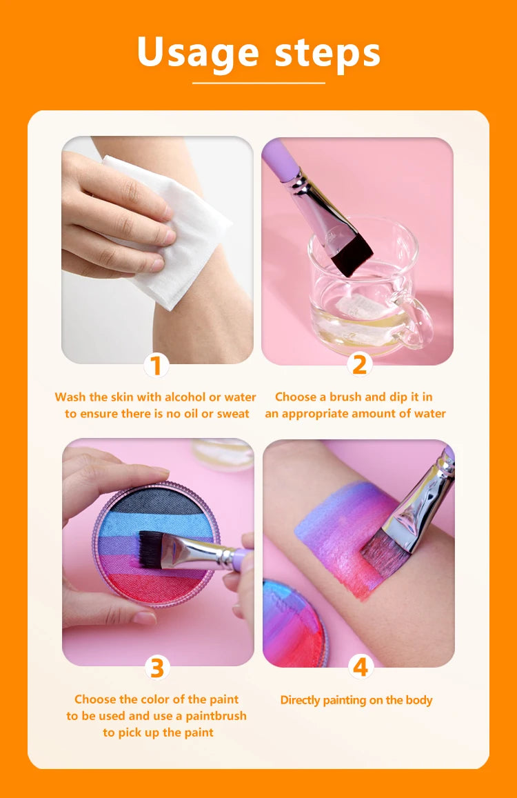 Usage: 1. Wet the paintbrush; 2. Dip in and adjust colors; 3. Quickly dry the color and paint freely on the skin. The colors can be superimposed, and the base color can be applied after drying; 4. Dark tones may leave some residue on the skin and need to be cleaned again with soap or shampoo.