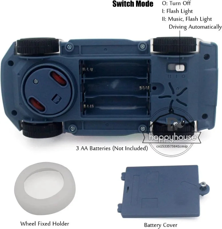 【Baby & Toddler Toys】Little kids enjoy chasing the running police car, which can stimulate their sense of sight hearing and touch, and exercise their eye-hand coordination. It is a great toy or gift for baby & toddler birthday, Christmas, etc. 【Transparent Gears】The outer shell of the police car is transparent, and the internal gears and structure can be clearly seen. When the car is driving, all gears will rotate. It is so amazing. 【Dazzling Light & Music】During driving, the vehicle will play music and emit dazzling light. The lights keep flashing and changing color, just like stage lighting. 【Two Modes】Turn the switch to position "I", the vehicle will emit dazzling light. Turn the switch to position "II", it will start playing dynamic music, driving automatically, and the gears will rotate. It is easy to play for little kids. 【Car Battery】The police car is powered by 3 AA Batteries (Not Included). You can buy the batteries in a local store.