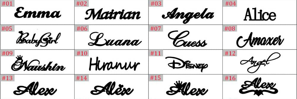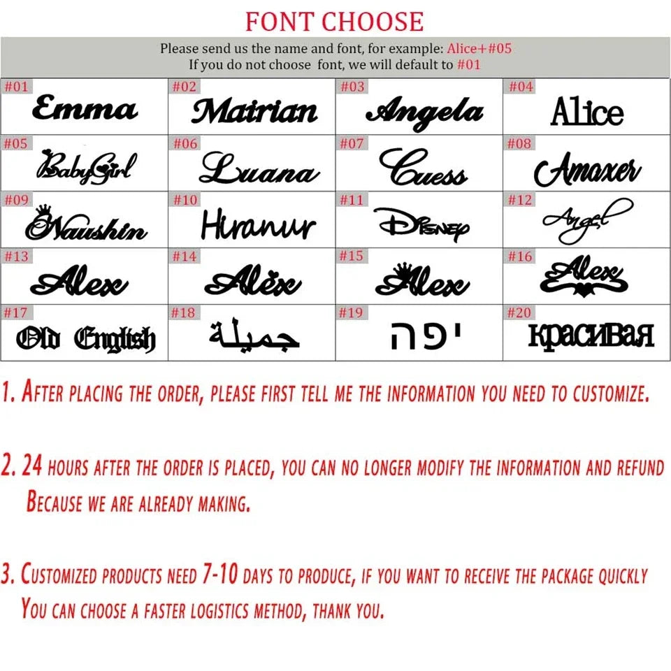 Note: Friends, before placing an order, please send us the name you want to customize, and then select the desired font type, (for example: Alice+#01), so that we can produce it, and finally you can submit the order.