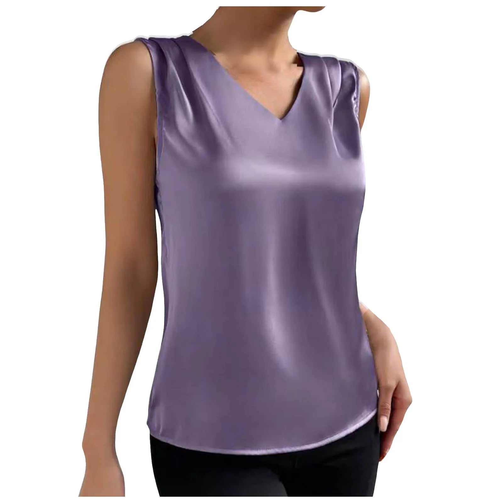 Women Summer V Neck Casual Soild Color Satin Sleeveless Basic Vest Shirt Fashionable Simple Sleeveless Top