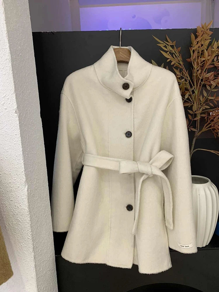 Double Sided Cashmere Coat For Women Winter Temperament Stand Collar Tied Woolen Overcoat Female Loose Waist Woolen Clothes