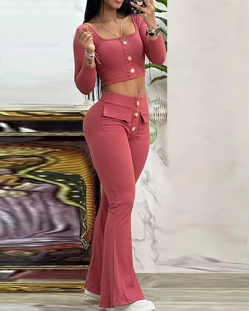 Elegant Suits for Women 2 Pieces Set Spring Autumn Fashion Square Neck Buttoned Top & Pocket Design Flared Pants Set Tracksuits