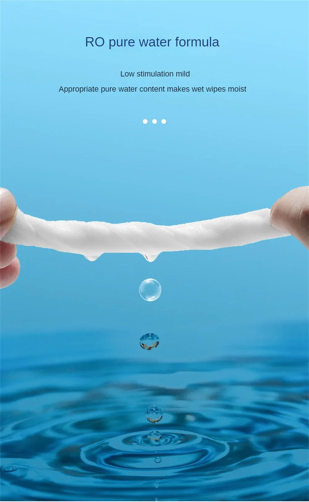 7. 【Peace of Mind Formula】: RO pure water formula, low stimulation, mild cleaning and appropriate pure water content, so that wet wipes have moisture