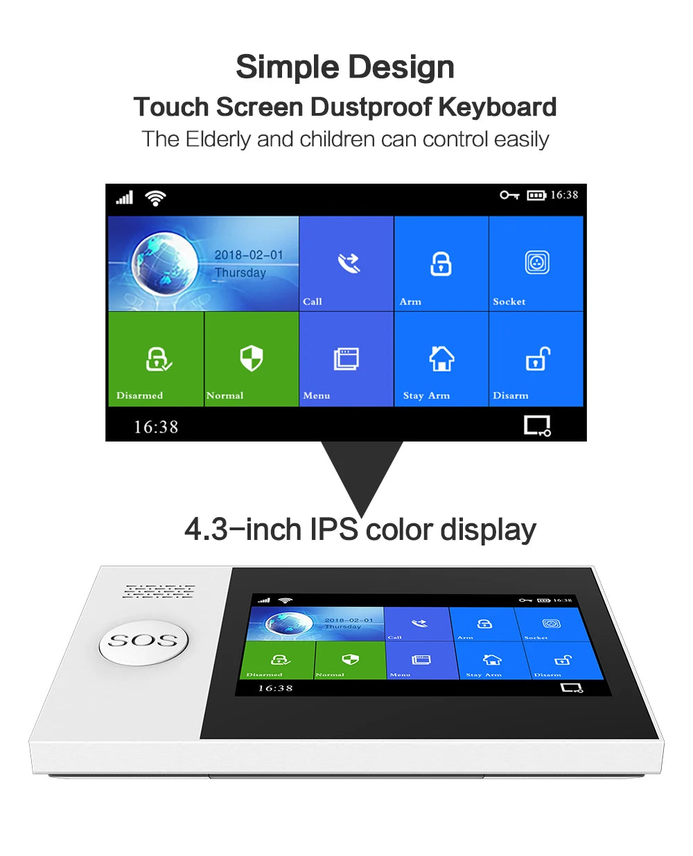 The alarm is PG107 2G version, which is a touch screen, and it is used with WIFI and SIM cards.